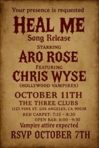 Los Angeles, CA – On Friday, October 11th, The Three Clubs in Los Angeles will be transformed into a gothic spectacle as rising star Aro Rose unveils her highly anticipated new single, “Heal Me.” This exclusive song release event will feature a special live performance with Chris Wyse, legendary bassist of the Hollywood Vampires, adding an electrifying edge to the night.